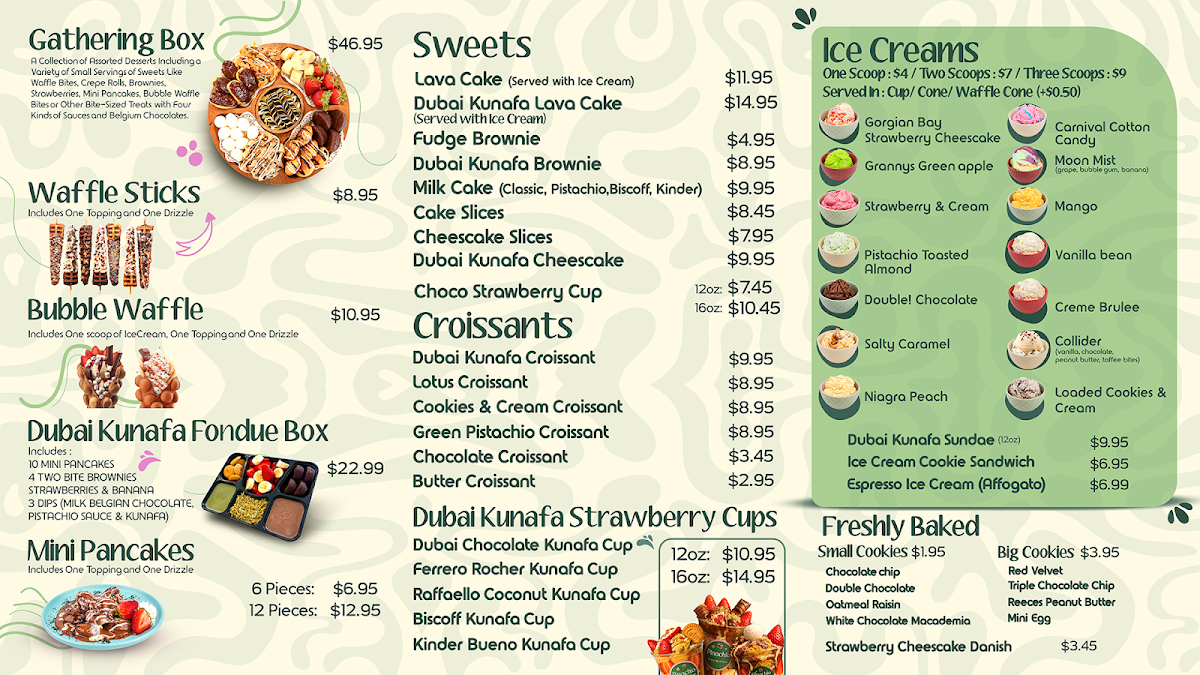Not to be missed are the charming Kunafa Cups, including the Ferrero Rocher Kunafa Cup and the Raffaello Coconut Kunafa Cup, each designed to impress with their beautiful presentation and tantalizing flavors. Customers rave about the Dubai Kunafa Cups—one reviewer described it as "incredibly rich, flavorful, and beautifully made,” perfectly showcasing the cafe's commitment to quality. For those looking for a refreshing drink, the selection of Fresh Smoothies is equally impressive, with flavors like Strawberry Banana and Mango Pineapple to quench your thirst and complement your dessert.